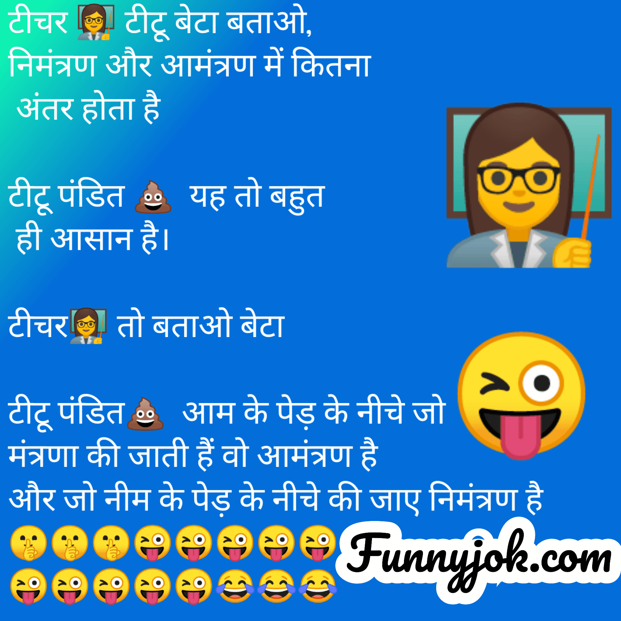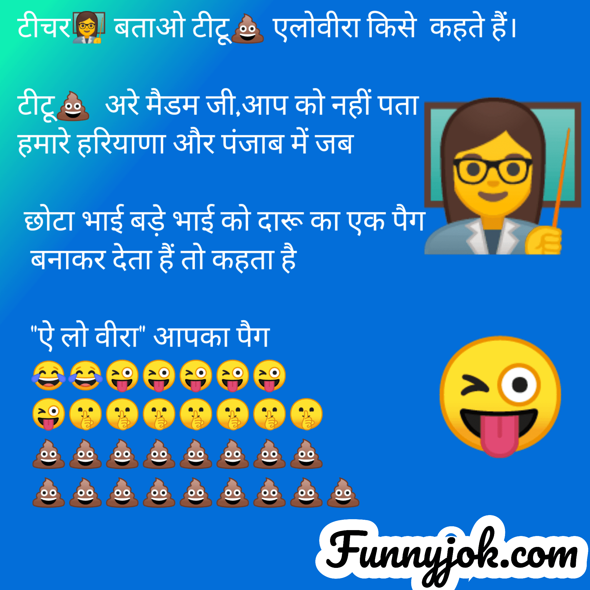 टीचर 👩🏫 एक बात बताओ टीटू बेटातुम पढ़ाई पर ध्यान क्यों नहीं देते होवीरटीटू पंडित 💩 मैडम पढ़ाई केवलदो कारणों से कि जाती हैं-1. डर से 2.शोख से ओर मै नहीं तोफ़ालतू के शोख रखता हूं औरनहीं किसी के बाप से डरता हूंटीचर 👩🏫 अभी तक बेहोश है😂😂😂😂😂😜😜😜😜😜😜💩💩💩💩💩💩💩💩💩💩💩💩