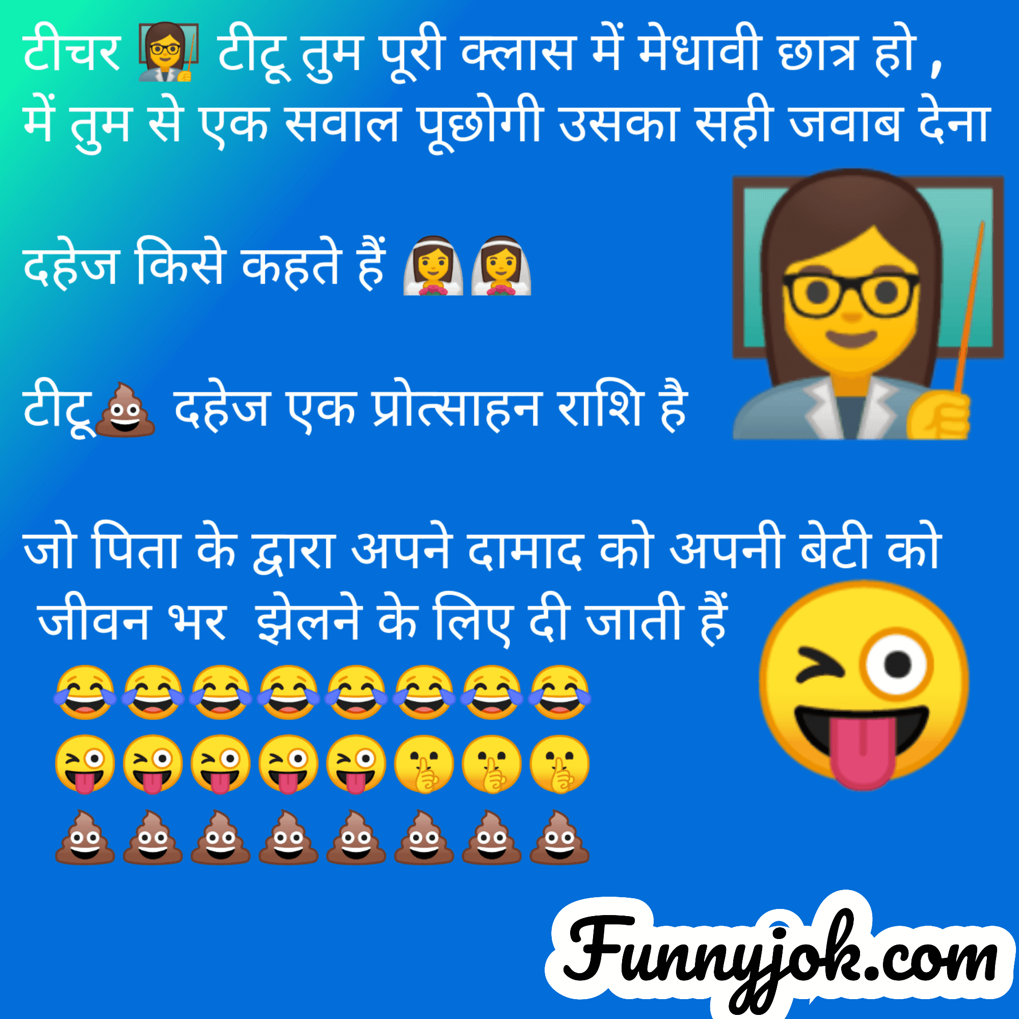 टीचर 👩🏫 टीटू तुम पूरी क्लास में मेधावी छात्र हो ,में तुम से एक सवाल पूछोगी उसका सही जवाब देनादहेज किसे कहते हैं 👰👰टीटू💩 दहेज एक प्रोत्साहन राशि है जो पिताके द्वारा अपने दामाद को अपनी बेटी कोजीवन भर झेलने के लिए दी जाती हैं😂😂😂😂😂😂😂😂😜😜😜😜😜🤫🤫🤫💩💩💩💩💩💩💩💩
